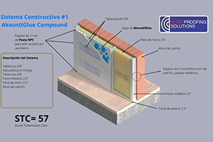AkoustiGlue Compound (AKG) es una goma resiliente diseñada para aplicarse en medio de dos hojas de yeso, triplay o MDF formando en su interior una membrana de desacople logrando la atenuación del ruido que se transmite a través de los muros. AKG aplicado en muros de panel de yeso alcanza atenuaciones de ruido con STC superiores a los 50 dB. AKG en muros se complementa con Pasta NPC que funciona como sellador acústico premium para perímetro, juntas, cajas eléctricas, orificios en muros, etc.
